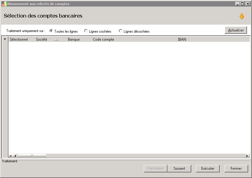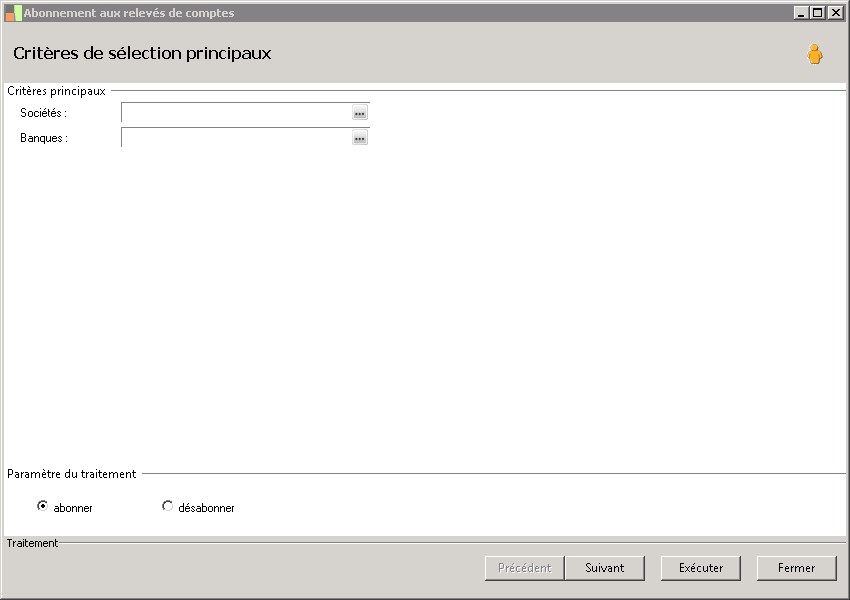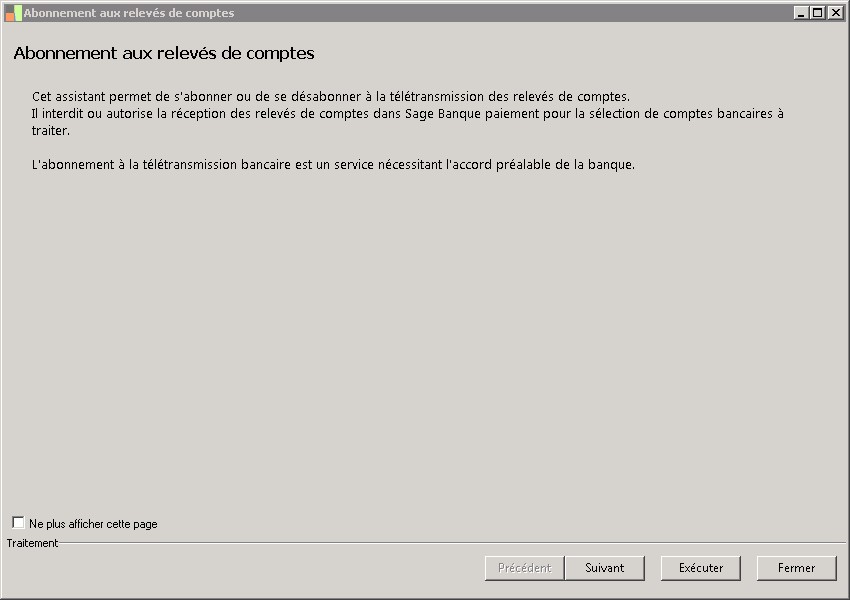 (Sage FRP 1000 Comptabilité) Menu Banque Paiement > Paramètres > Relevés > Abonnement aux relevés de comptes