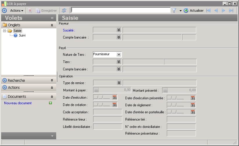 Lorsque le sens de l'ordre est décaissement (Virement)Société liée au compte payeur lorsque le sens de l'ordre est décaissement (débit du compte du donneur d'ordre).Cette information est obligatoire et permet d'identifier la société lorsque l'information du compte bancaire payeur n'est pas établie (l'information du compte bancaire est cependant obligatoire pour confirmer l'ordre).Lorsque le sens de l'ordre est encaissement (LCRPrélèvement)Dans le cadre des prélèvements cette information représente la société liée au compte bénéficiaire.Cette information est obligatoire et permet d'identifier la société lorsque l'information du compte bancaire bénéficiaire n'est pas établie (l'information du compte bancaire est cependant obligatoire pour confirmer l'ordre).Dans le cadre des LCRcette information représente le tireur de l'effet.Dans le cas d'un endossement de l'effet, le tireur se distingue du bénéficiaire de l'effet lequel est défini en tant que tiers endossé (cf. saisie complémentaire). |
