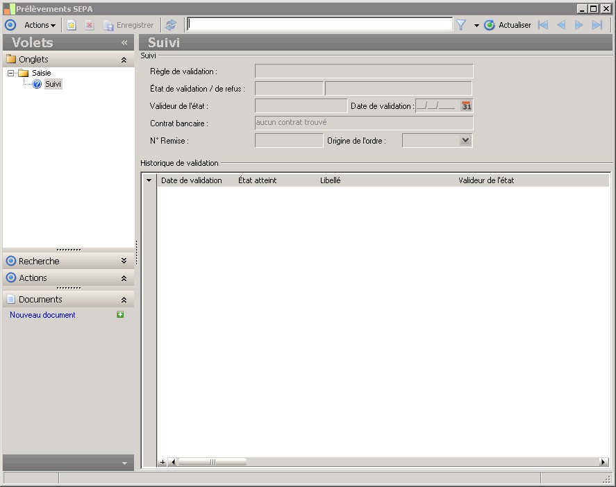 La nature de validation détermine la règle de validation qui sera liée à l'ordre. La nature est elle même déterminée par le groupe de validation associé au rôle du tiers de l'ordre.En l'absence d'une nature de validation, un ordre confirmé est considéré comme valide et peut faire l'objet d'une remise bancaire. |
