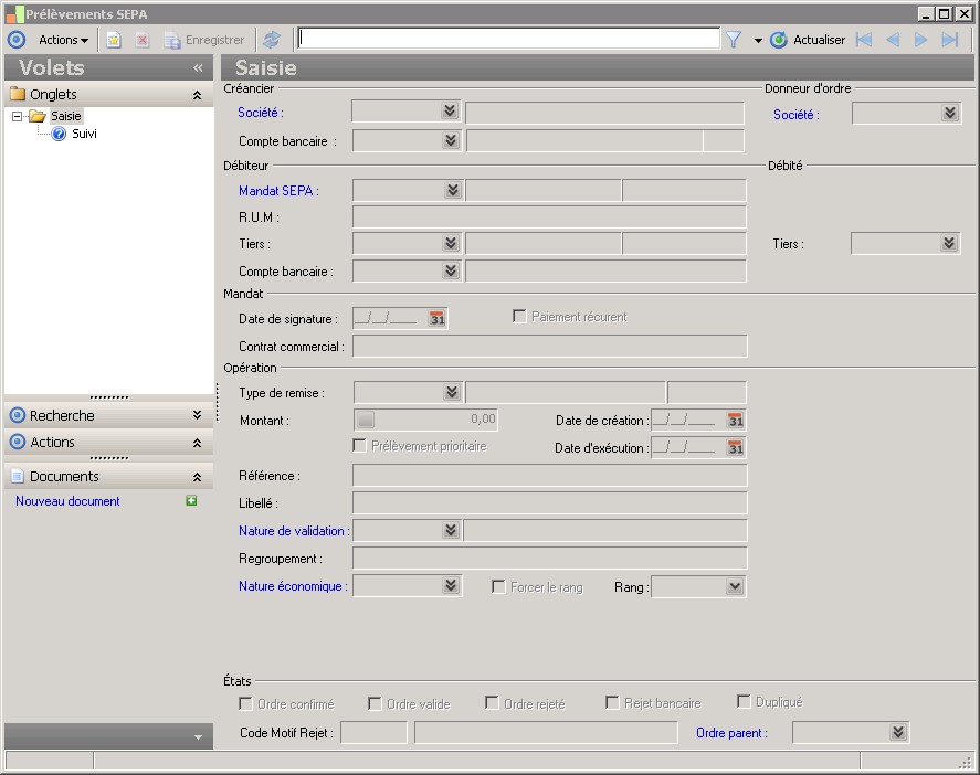 Ce champ permet de sélectionner la RUM (Référence Unique du Mandat) à associer à l'ordre de prélèvement. Le prélèvement est piloté par le mandat, c'est lui qui ramène les éléments comme le tiers ou le compte. |