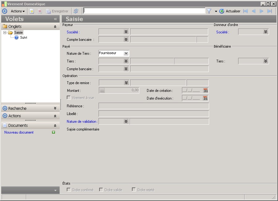 (Sage FRP 1000 Comptabilité) Menu Banque Paiement > Ordres bancaires > Virement Domestique