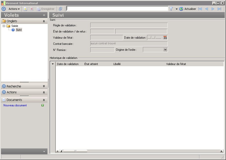 La nature de validation détermine la règle de validation qui sera liée à l'ordre. La nature est elle même déterminée par le groupe de validation associé au rôle du tiers de l'ordre.En l'absence d'une nature de validation, un ordre confirmé est considéré comme valide et peut faire l'objet d'une remise bancaire. |