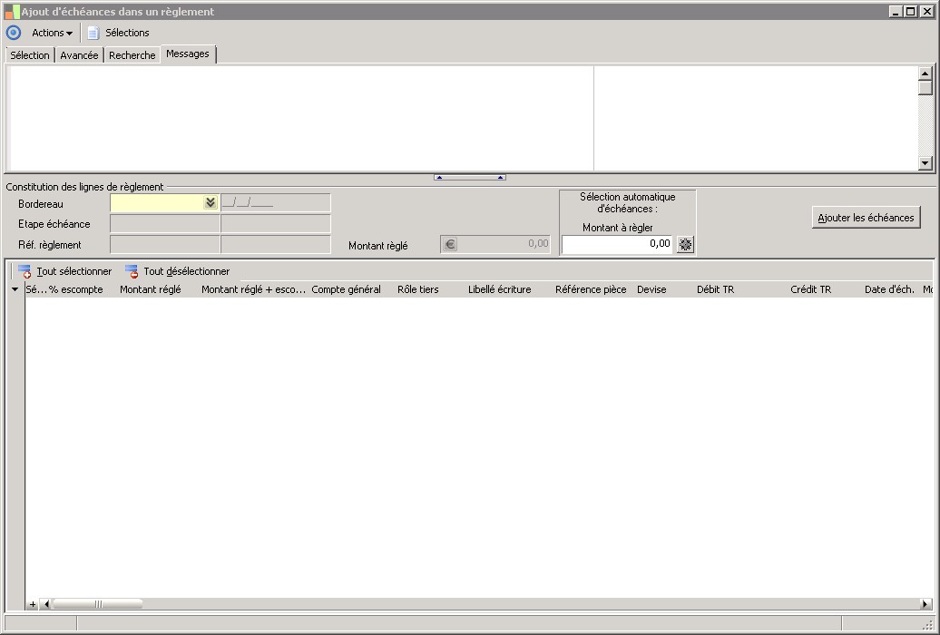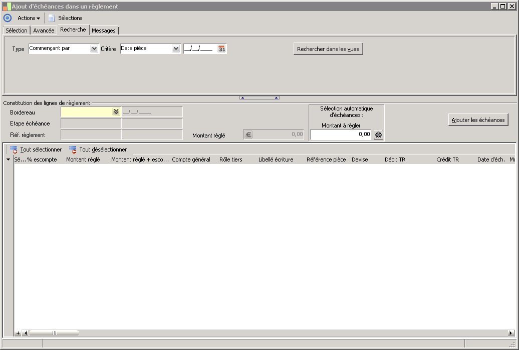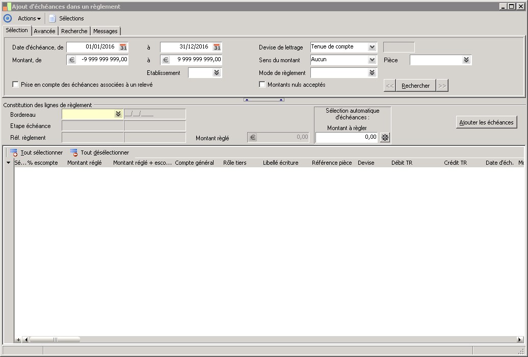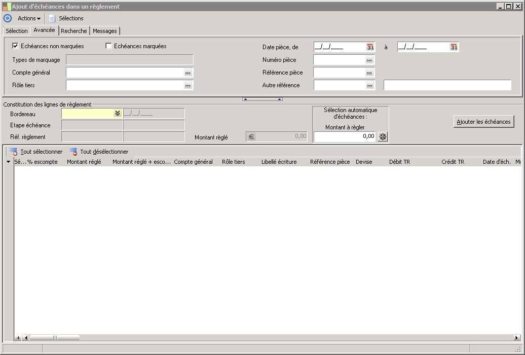 Il est possible de sélectionner les échéances à règler par rapport à la référence de la pièce associée aux échéances. |