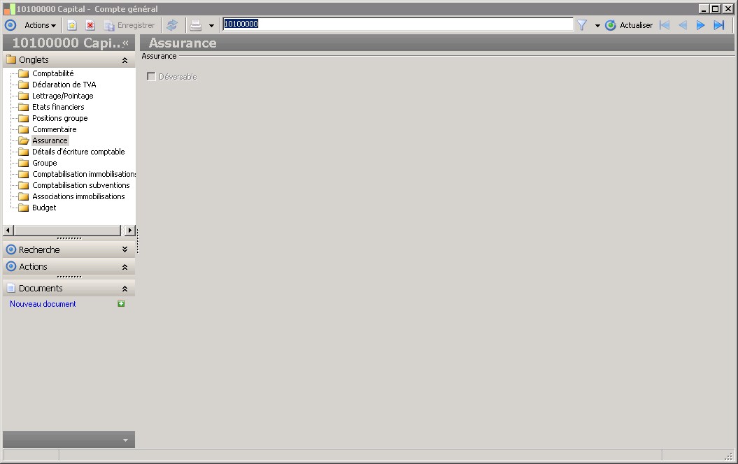Seuls les comptes déversables peuvent faire l'objet d'un déversement assurance.Un compte général peut être rendu déversable si :- la nature du compte est "autre"- s'il ne s'agit pas d'un compte collectif |