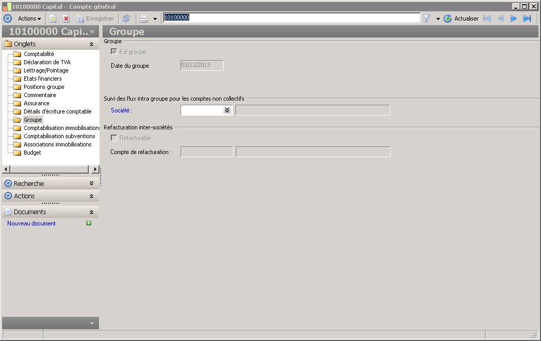 La société permet d'identifier les flux intra-groupe pour les comptes non collectifs. Lors de la création d'écritures sur le compte, si le type de pièce gère le suivi des flux intra-groupe, le code société associé au compte est repris automatiquement sur la pièce comptable. |
