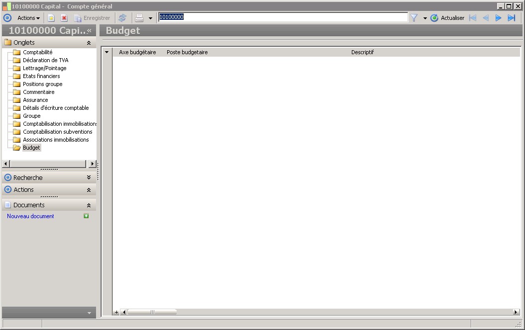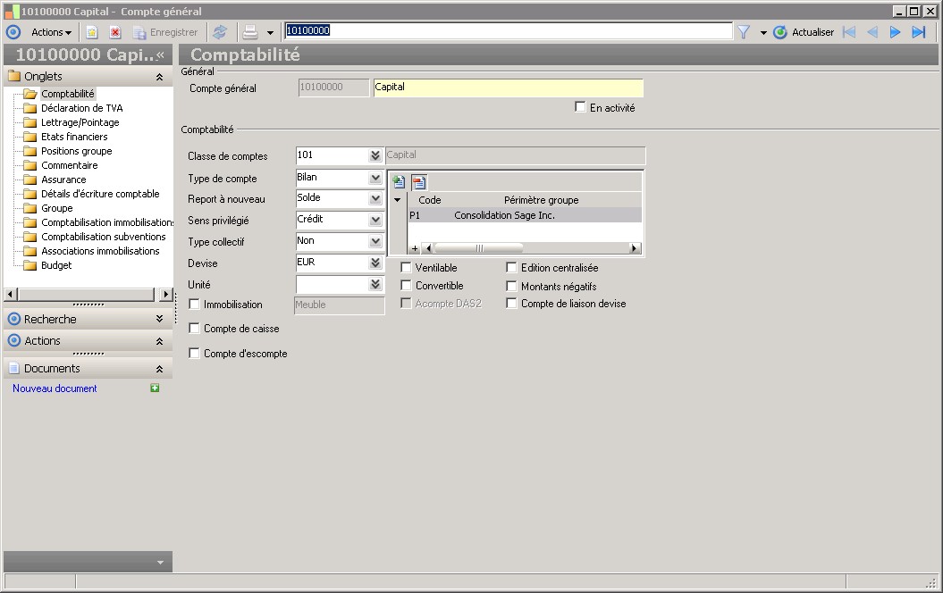 Cette zone vous permet d'indiquer le code unique du compte général correspondant au Plan des Comptes utilisé par votre entreprise. Le code saisi doit correspondre à la structure des codes comptes généraux définie dans les paramètres société. Dans le contexte de la comptabilité, si le code saisi appartient à une fourchette de comptes pour laquelle un profil de compte a été défini, ses valeurs seront proposées par défaut.On associe au compte général une devise privilégiée qui sera proposée par défaut lors de la création d'écritures sur ce compte.Dans le contexte de la comptabilité, on peut aussi associer un compte général à un ou plusieurs périmètres groupes. Ainsi, on pourra effectuer des éditions spécifiques par périmètre groupe (exemple : balance générale).Enfin, il est possible de suivre un compte en quantité. Dans ce cas, il faut indiquer dans quelle unité ces quantités seront exprimées. |