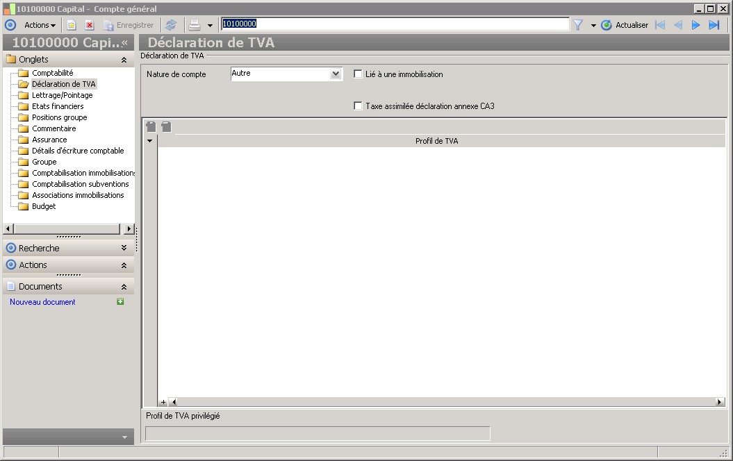 L'attribut nature de compte précise les relations entre le compte général et la TVA lorsque ce compte est lié à la gestion de la TVA. On a le choix entre plusieurs natures:- TTC : cette nature s'applique plus particulièrement aux comptes collectifs (par ex. : clients, fournisseurs)- HT : cette nature s'applique aux comptes de bilan ou de gestion (immobilisations, classe 6 et 7) -TVA : cette nature s'applique aux comptes enregistrant la TVA.- Autre : pour tous les comptes ne permettant pas de gérer la TVA.Si la nature du compte est HT, il faut obligatoirement indiquer un ou plusieurs profils de TVA (dont un déclaré privilégié). Dans le contexte de la comptabilité, ce profil de TVA permettra le calcul et la comptabilisation automatique de la TVA en saisie. |