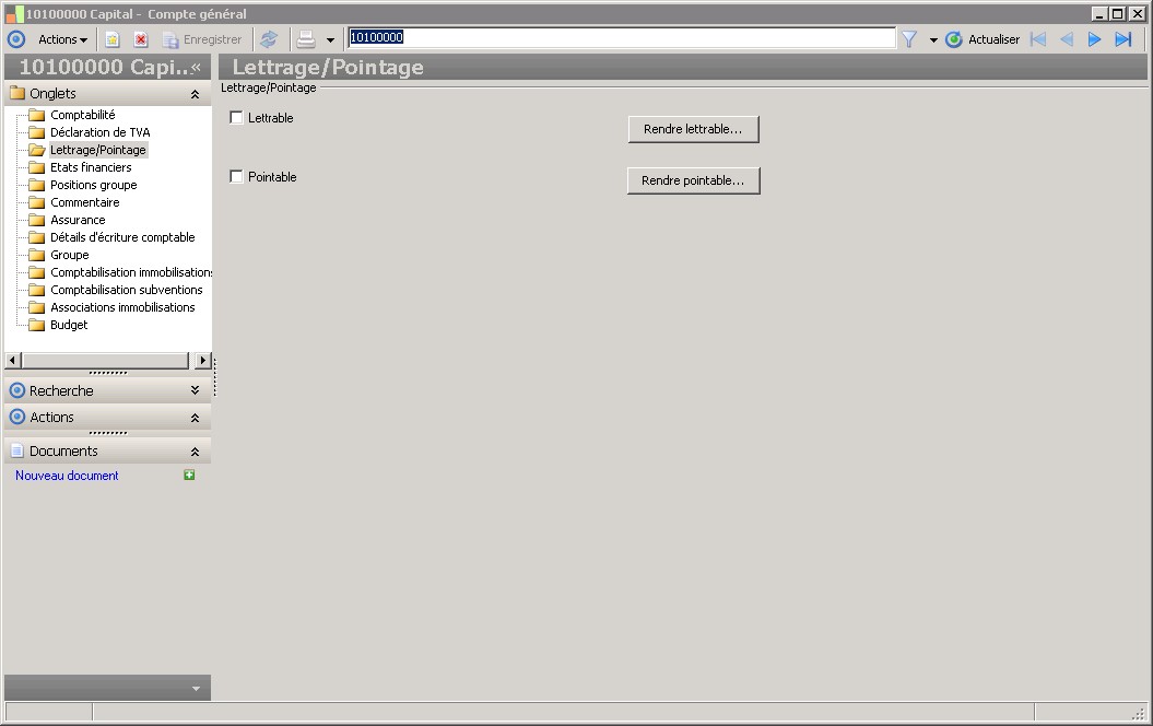 Un compte général doit être déclaré pointable s'il est pertinent de permettre une sélection (totale ou partielle) de ses mouvements à des fins de rapprochement bancaire. Un compte ne peut pas être simultanément lettrable et pointable. Un compte déclaré pointable doit obligatoirement être rattaché à un compte bancaire établissement et à un compteur de pointage. |