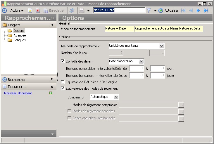 Cet attribut permet de sélectionner la méthode de raprpochement à utiliser.- Combinatoire : indique que le rapprochement automatique s'effectue en combinant les nombres d'écritures bancaires et comptables. Les combinaisons se font du nombre le plus fin au plus large.- Somme (1 bancaire/N comptables) : indique que le rappprochement automatique s'effectue en rapprochant une écriture bancaire avec la somme de toutes les écritures comptbales.- Somme (N bancaires/1 comptable) : indique que le rappprochement automatique s'effectue en rapprochant une écriture comptable avec la somme de toutes les écritures bancaires.- Somme (N bancaires/N comptables) : indique que le rappprochement automatique s'effectue en rapprochant la somme des écritures bancaires avec celle des écritures comptbales.- Unicité des montants : indique que le rapprochement automatique s'effectue en vérifiant l'unicité des montants. Si au moins deux écritures comptables ou au moins deux écritures bancaires ont le même montant, le rapprochement ne sera pas réalisé.- Ajustement bancaire : indique que le rapprochement automatique s'effectue en combinant les écritures bancaires au débit et au crédit. Les combinaisons se font du nombre le plus fin au plus large.- Ajustement comptable : indique que le rapprochement automatique s'effectue en combinant les écritures comptables au débit et au crédit. Les combinaisons se font du nombre le plus fin au plus large. |