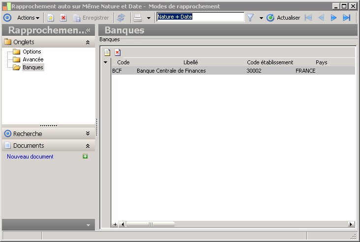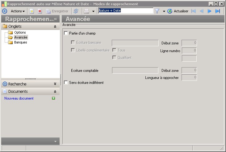 Nombre d'écritures bancaires :Lorsque la méthode de rapprochement est combinatoire, il est possible de rapprocher plusieurs écritures comptables avec une ou plusieurs écritures bancaires et vice et versa.Il faut indiquer ici le nombre maximum d'écritures bancaires à tester pour réaliser le rapprochement.Exemple : soit 1 écriture comptable ayant la référence de pièce 000001 et 2 écritures bancaires ayant la même référence origine 000001. Le rapprochement sur l'équivalence des références est réalisé si le nombre maximum d'écritures bancaires spécifié ici est au moins 2.Crédit :Lorsque la méthode de rapprochement est ajustement bancaire ou ajustement comptable, il est possible de rapprocher des montants débits avec des crédits.Il faut indiquer ici le nombre d'écritures au crédit à tester pour réaliser le rapprochement. |