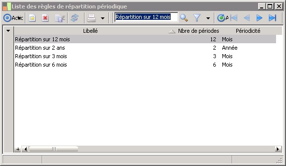 permet de créer la règle de répartition. Saisir dans la colonne libellé Mensuelle sur 1 an, ensuite indiquez 12 dans la colonne Nombres de périodes puis sélectionnez, la périodicité.