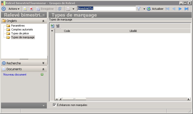 Le code "Type de marquage" permet d'identifier de manière unique le type de marquage.Le marquage est une information extra-comptable, qui intervient indépendemment soient sur les écritures comptables, soient sur les écritures d'échéances (ex : bon à payer, ...).C'est un critère de sélection des écritures lors de consultation ou d'édition.Le marquage correspond essentiellement à annoter les écritures en vue d'un traitement à posteriori (révision comptable, écriture litigieuse...). |