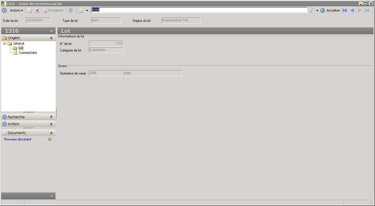 Il existe deux catégories de lot :- Exploitation : pour les lots contenant des pièces d'exploitation comme des écritures d'achat ou de vente par exemple.- Retraitement : pour les lots contenant des pièces de nature nationale ou IAS / IFRS correspondant à des écritures de fin de période comme les amortissements par exemple.Cet attribut a pour but de ne pas mélanger les pièces selon le mode de saisie utilisé(Exploitation ou Retraitement). |