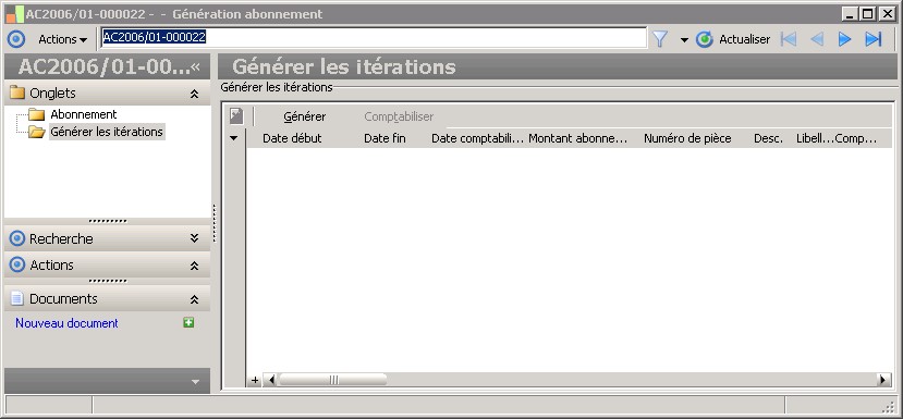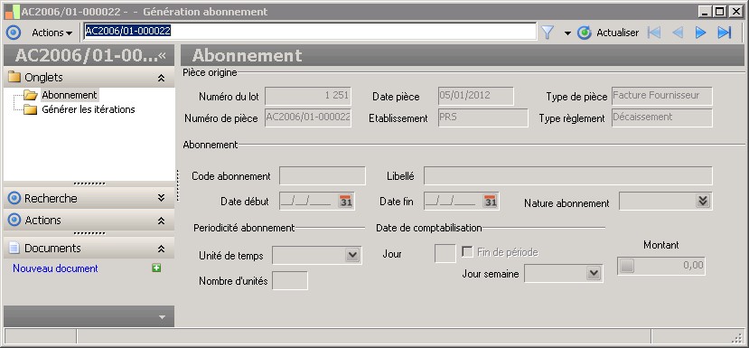 (Sage FRP 1000 Comptabilité) Menu Immobilisations > Paramètres > Comptabilité générale > Génération abonnement