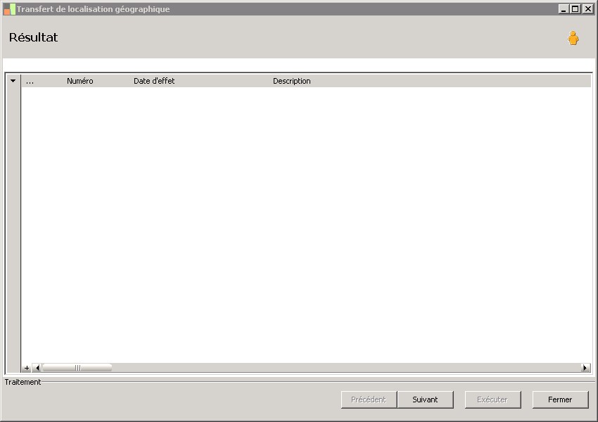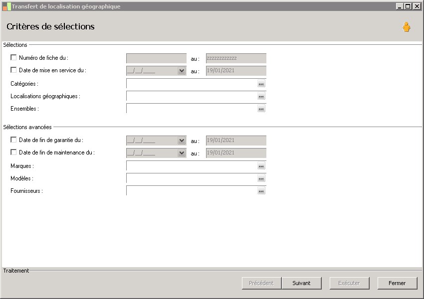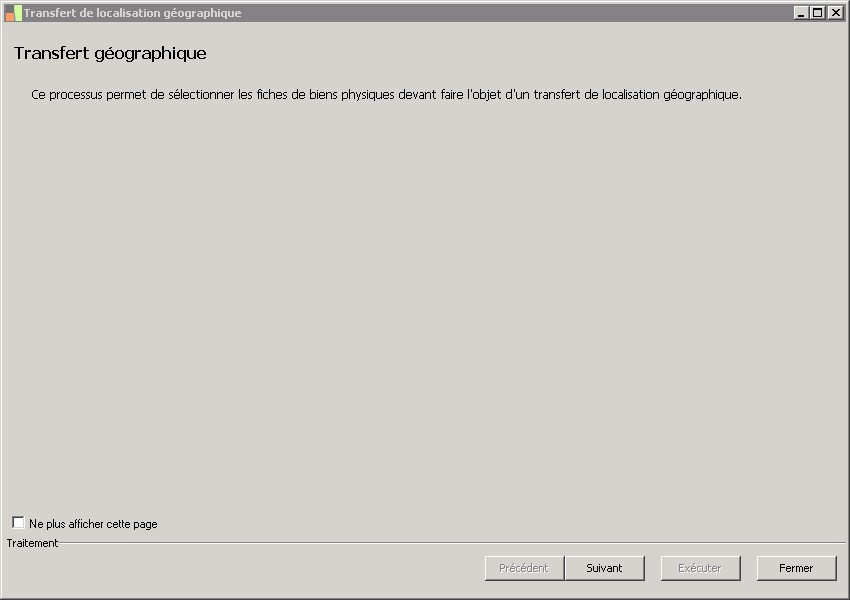 (Sage FRP 1000 Comptabilité) Menu Immobilisations > Suivi physique > Localisation géographique > Transfert de localisation géographique