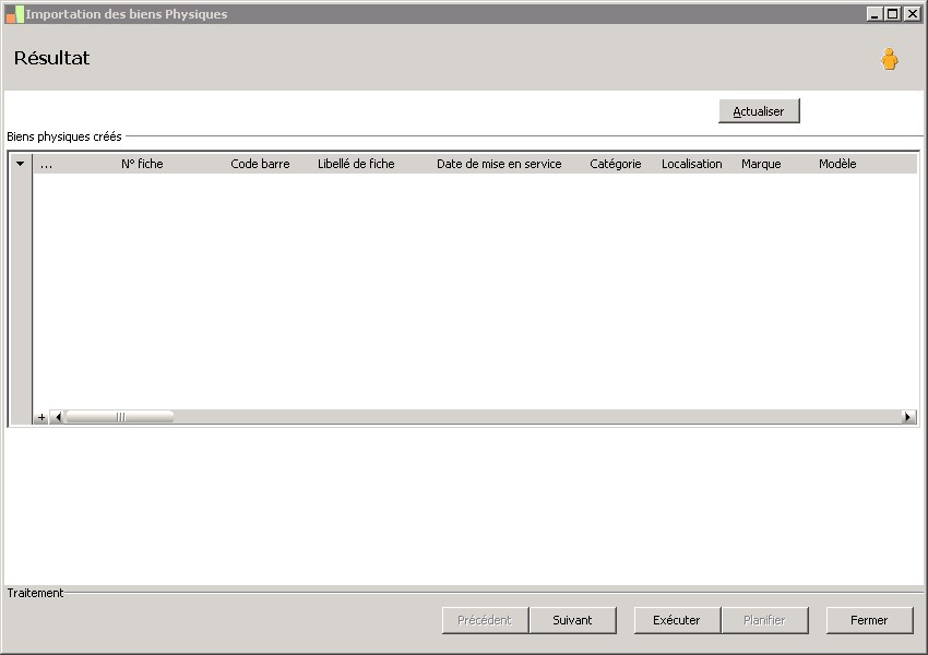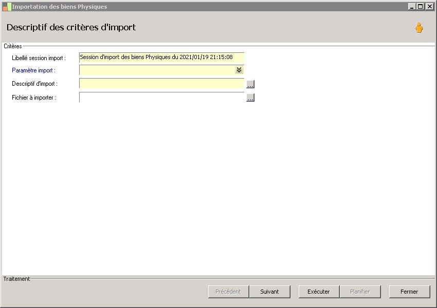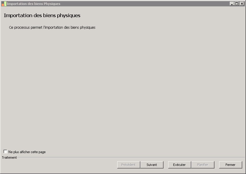 (Sage FRP 1000 Comptabilité) Menu Immobilisations > Initialisation > Import du suivi physique > Importation des biens Physiques