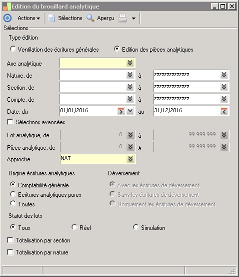 Cette zone est accessible uniquement lorsque le type d'édition 'Edition des pièces analytiques' est sélectionné, elle permet de réaliser une totalisation des écritures analytiques par nature.