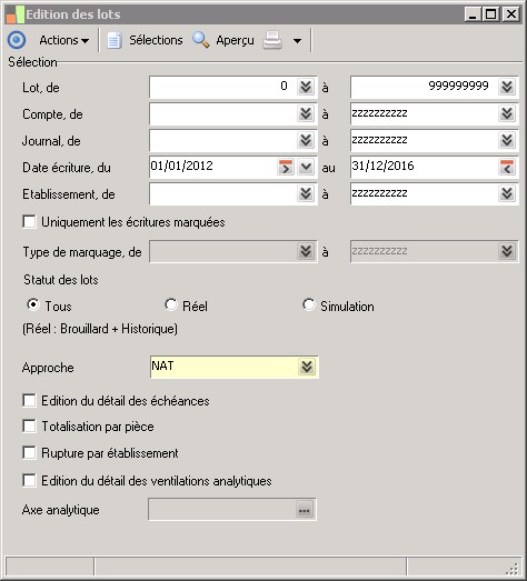 (Sage FRP 1000 Comptabilité) Menu Immobilisations > Paramètres > Comptabilité générale > Edition des lots