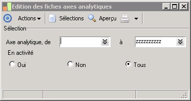 Indiquer le niveau d'activité des axes analytiques sélectionnés. Il est possible d'éditer que les axes analytiques actifs, que les inactifs ou tous les axes analytiques.