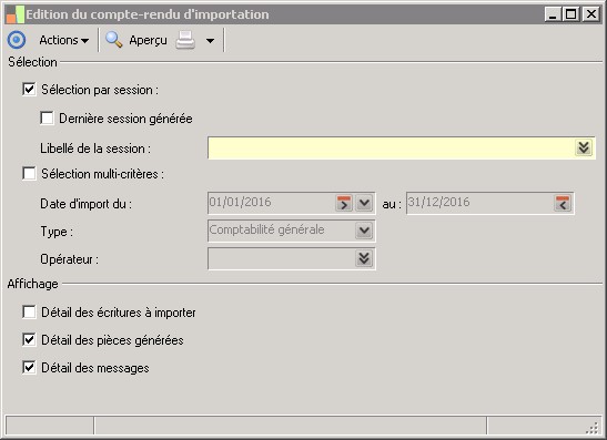- L'option Dernière session générée qui permet, lorsqu'elle est activée, d'éditer la dernière session générée. Cette option est utile par exemple, en cas de planification de l'import via un automate afin de pouvoir éditer le compte-rendu de la session qui vient d'être importée.