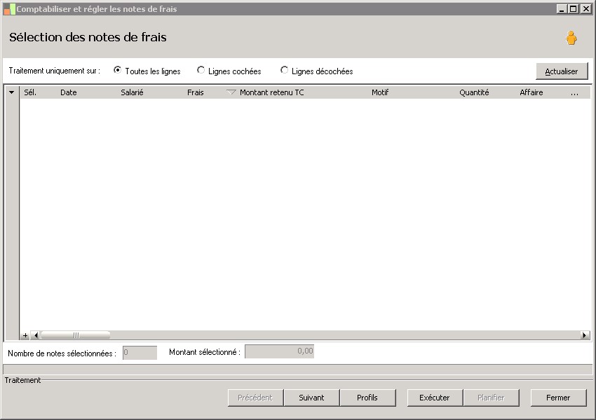 Les notes de frais proposées à la sélection sont celles qui répondent aux critères de sélection saisis.