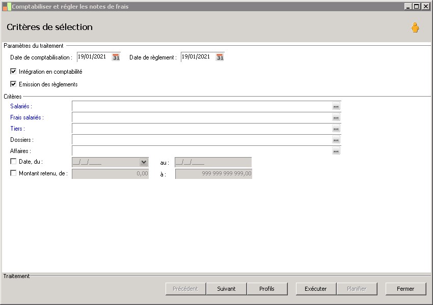 Cet écran permet de renseigner des critères de sélection des notes de frais à régler.