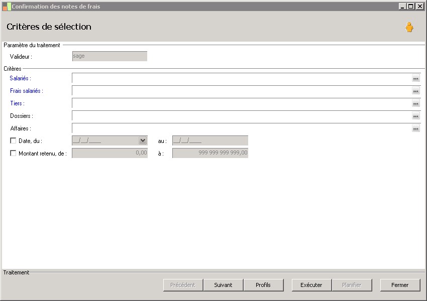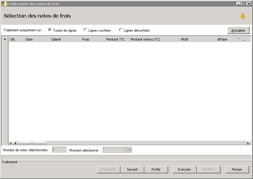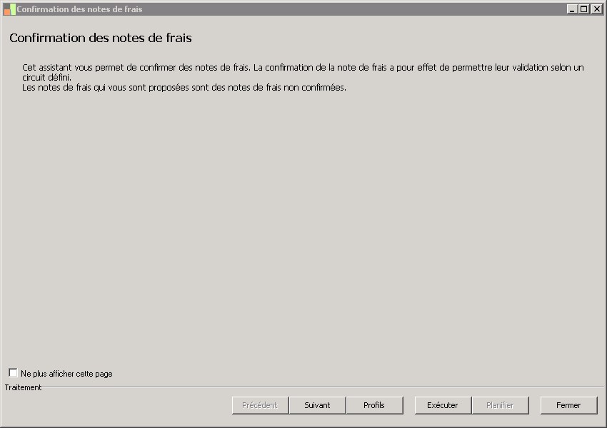 Cette fonction permet de confirmer les notes de frais dans le cas d'un traitement de masse. Elle est lancée à partir de la fonction