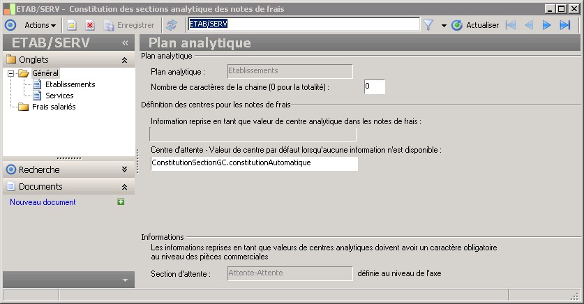 Pour un axe avec constitution automatique du code section, cette zone permet d'indiquer une valeur de texte qui sera reprise en tant que centre par défaut lorsqu'aucune valeur de centre d'achat ou d'engagement n'aura été trouvée. Plus précisément, la valeur de cette zone sera reprise sous les conditions suivantes :Pour une commande achat- Lorsque la valeur du centre achat est renseignée mais n'est pas trouvée- Lorsque la valeur du centre achat n'est pas renseignée mais qu'un code section est généré par le biais d'un autre plan de l'axe. Pour un détail d'engagement- Lorsque la valeur du centre engagement est renseignée mais n'est pas trouvée- Lorsque la valeur du centre engagement n'est pas renseignée mais qu'un code section est généré par le biais d'un autre plan de l'axe ayant une valeur de centre d'engagement renseignée et trouvée.La concaténation des centres des plans analytiques ayant un centre analytique défini en engagement constituera le code analytique du détail d'engagement. Pour constituer la section analytique de la commande d'engagement, ce code analytique sera complété le cas échéant des valeurs de plans n'ayant pas de centres d'engagement définis lors de la génération de la commande d'engagement. Le code section du détail d'engagement présente l'information du code section provisoire de la commande, c'est-à-dire du code analytique complété des valeurs de centre d'attente-par défaut pour les plans analytiques n'ayant pas de centres d'engagement définis. S'agissant d'une information provisoire, elle n'est pas présentée en standard dans l'écran de l'analytique du détail engagement.Ce code analytique peut être considéré comme définitif lorsque la chaîne d'achat n'est pas utilisée, particulièrement au niveau de la génération de commande achat. Dans ce dernier cas, il pourra être intéressant de ne pas renseigner une valeur de centre d'attente-valeur par défaut qui corresponde au centre d'attente du plan analytique mais de renseigner une valeur de centre différente (cf. remarque 2 ci-dessous).Rappel : l'analytique du détail d'engagement est généré au moment de la création de sa proposition d'achat. Pour une commande d'engagementPour une commande d'achat issue des engagements, la valeur de centre du plan est reprise tel quel de l'analytique de l'engagement (code analytique) et n'est pas modifiée dans tous les cas. Seules les informations de centre d'attente-valeurs par défaut des plans n'ayant pas de centres d'engagement définis sont remplacées au niveau du code section provisoire par la valeur du centre d'achat lorsque défini. A défaut d'être trouvée, c'est l'information de la valeur de centre d'attente-valeur par défaut existante au moment de la génération de commande qui s'applique lorsque définie. Veuillez cependant noter les points suivants lors de votre paramétrage d'axe analytique.1) La valeur du "Centre d'attente (Valeur par défaut lorsqu'aucune information n'est disponible)" est une valeur qui ne s'applique que lorsqu'un code section doit être constitué, c'est-à-dire que lorsqu'il existe au niveau de l'axe au moins un plan analytique ayant une valeur d'attribut renseignée au niveau de l'une des zones "Information reprise en tant que valeur de centre analytique en achat" ou "Information reprise en tant que valeur de centre analytique en engagement". Aucun code section ne sera généré sur l'axe lorsque tous les plans analytiques mentionneront une valeur de centre d'attente sans attributs mentionnés sur les 2 zones précitées ou l'une seule (selon contexte d'utilisation ou non des engagements ou de la chaîne achat au niveau de votre société).2) Il est préconisé d'indiquer la valeur de centre d'attente éventuellement définie au niveau de l'axe dans la mesure où il sera peu fréquent qu'une valeur de centre analytique en achat et en engagement ne soit pas trouvée. Il peut être néanmoins intéressant d'indiquer une valeur ne correspondant pas au centre d'attente dans le cadre où l'une des informations reprise en tant que centre analytique pour les achats ou les engagements ne sera pas définie.Ainsi et par exemple, il pourra être intéressant de définir une valeur de centre par défaut égale à MAG (Magasin) pour un plan analytique Service n'ayant pas de valeur définie de centre analytique pour les achats mais en ayant une pour les engagements : Tous les achats n'étant pas issus des engagements seront réputés effectués sur le centre MAG (Ce qui évite un retraitement du centre d'attente) tandis que les achats issus des engagements reprendront en tant que centre le code Service du demandeur.La reprise du centre par défaut ainsi défini s'effectuera uniquement sous les conditions évoquées au niveau de la remarque nb1.3) Lorsqu'une information de centre analytique pour les engagements est paramétrée au niveau du plan analytique et qu'aucune valeur de centre d'attente n'est renseignée, le code section peut être constitué de façon partielle lors du traitement de génération des propositions d'achat si la valeur retournée par l'attribut choisi au niveau de centre pour les engagements est vide.Ce sera par exemple le cas si vous indiquez un attribut basé sur le produit renseigné au niveau de la demande d'engagement et que l'utilisateur ne renseigne pas de produit (zone optionnelle par défaut)Ce fonctionnel est partiellement contrôlé au moment du paramétrage de l'axe analytique avec le message d'alerte suivant (Exemple) :Attention : La zone "Information reprise en tant que valeur de centre analytique en engagement" du plan Famille de l'axe analytique ETS(Equivalence des unités) est renseignée alors qu'aucune valeur n'est définie au niveau de la zone "Centre d'attente". Les commandes d'achat issues des engagements auront leurs codes section partiellement générés si aucune valeur n'est trouvée en tant que centre pour les engagements. Pour avoir un code section compl