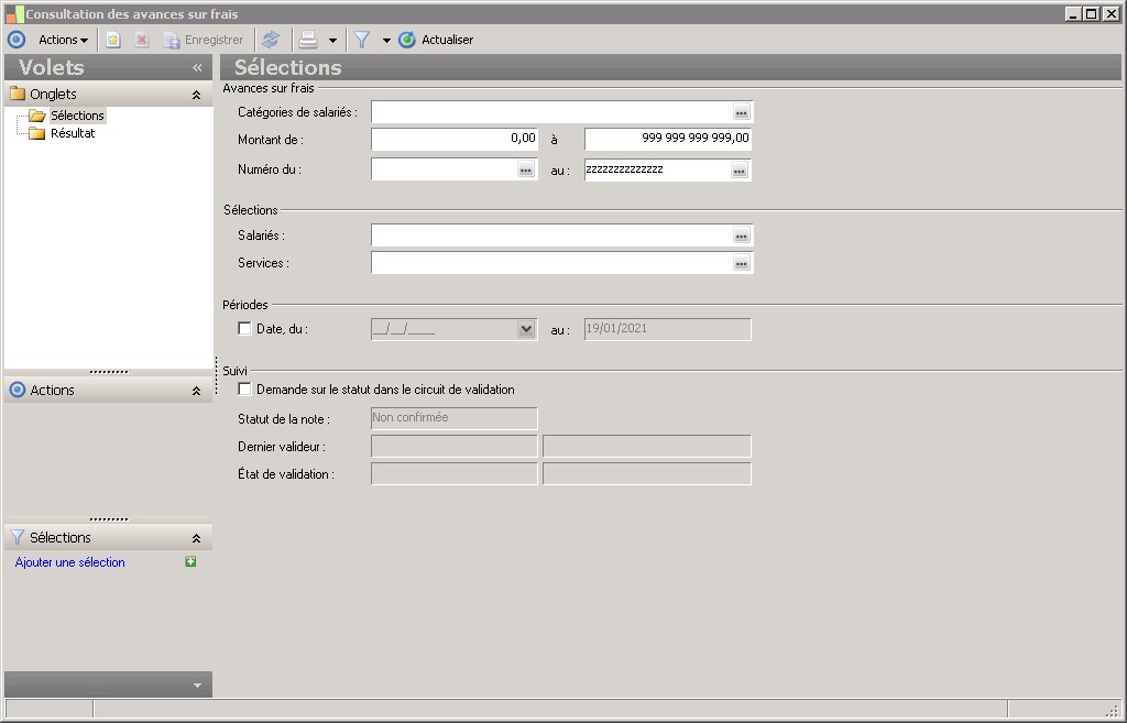 Il est possible d'effectuer une sélection des avances sur frais en fonction de l'étape de validation de l'avance sur frais. Cette sélection est possible quand la sélection sur le statut a été activée et que le statut sélectionné est différent de Non Confirmée. |