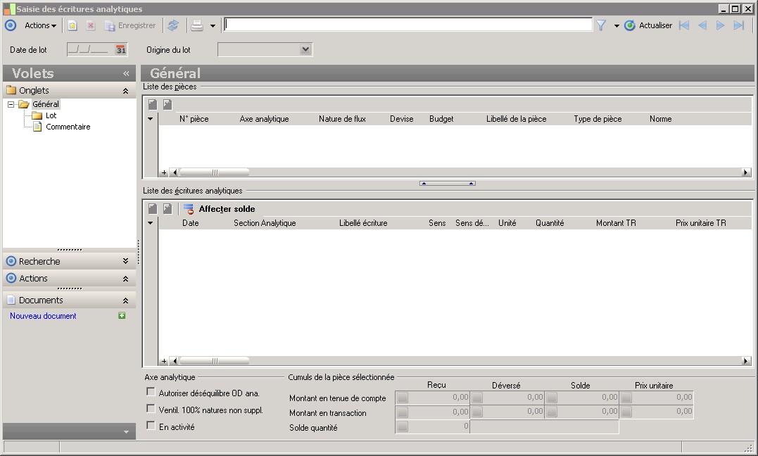 La ventilation à 100 % des natures non supplétives (natures de flux ayant des comptes de comptabilité générale rattachés) a 2 incidences :1- Dans le cas d'une ventiliation d'une écriture de comptabilité générale, elle implique que la validation des écritures analytiques de la pièce ne peut être effective que si la sommation de ses écritures est égale au montant de l'écriture de comptabilité générale.2- Dans le cas d'une écriture analytique pure portant sur une nature non supplétive, elle oblige que la pièce analytique soit équilibrée en débit-crédit (déversé-reçu) c'est-à-dire que le solde pièce soit nul.Cette restriction permet que le solde de la nature de flux soit le reflet de la comptabilité générale. En effet, seules les natures supplétives peuvent enregistrer des écarts de valorisation par rapport à la comptabilité générale.Attention : Un axe qui n'est pas ventilable à 100% dès l'origine ne peut plus le devenir. |
