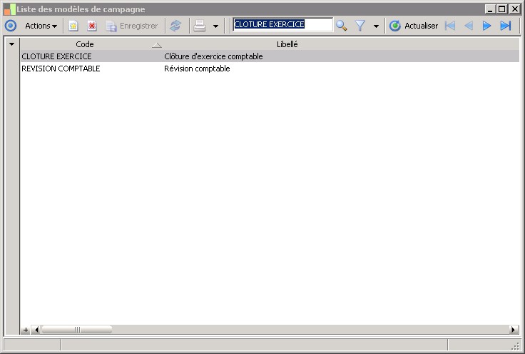 (Sage FRP 1000 Suite Financière) Menu Campagne > Campagnes > Liste des modèles de campagne