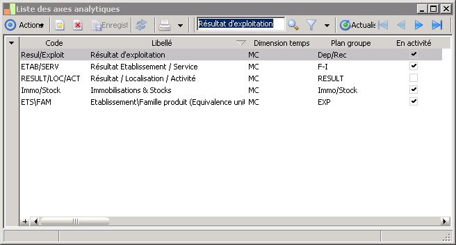 Axe analytique en activité. La saisie d'écriture analytique (ventilations ou écritures analytiques pures) est possible sur un axe en activité. |