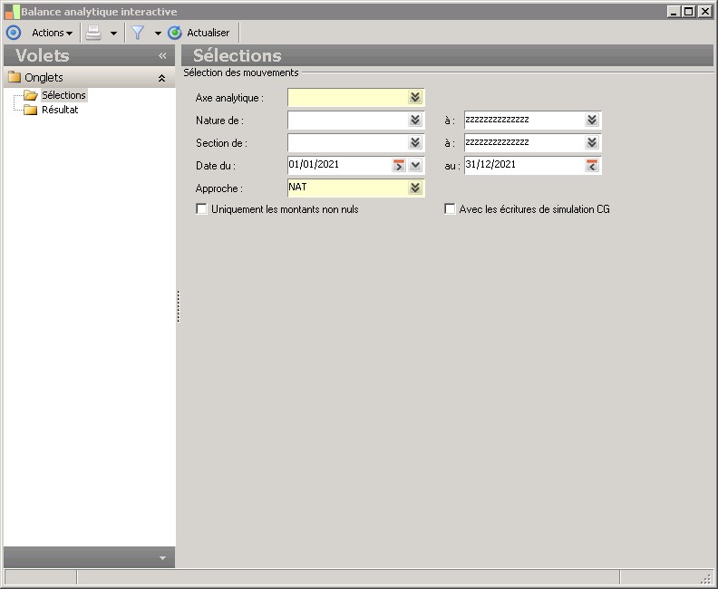 Sélectionnez au minimum l'axe analytique et les dates de début et fin de la période interrogéepuis cliquez sur le bouton Actualiser.