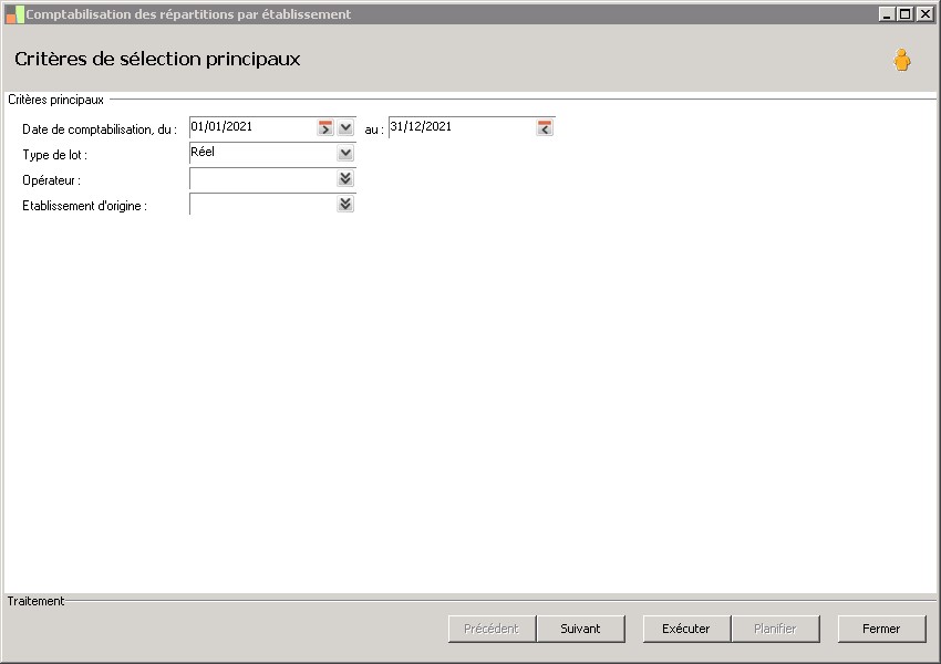 Ce rôle permet de renseigner un établissement d'origine afin de limiter la recherche des répartitions à comptabiliser. Si un établissement est renseigné, seules les répartitions de cet établissement sont recherchées sinon le programme recherche toutes les répartitions quelque soit leur établissement. |