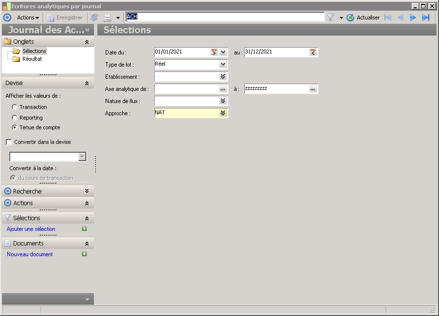 (Sage FRP 1000 Suite Financière) Menu Comptabilité > Analytique > Interrogations / Consultations > Ecritures analytiques par journal