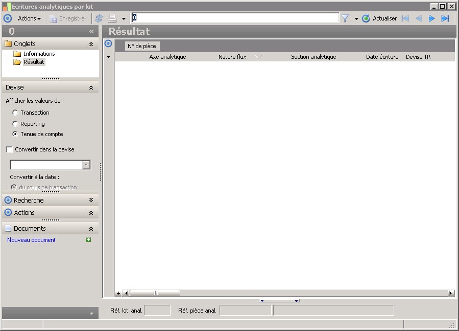 (Sage FRP 1000 Suite Financière) Menu Comptabilité > Analytique > Interrogations / Consultations > Ecritures analytiques par lot