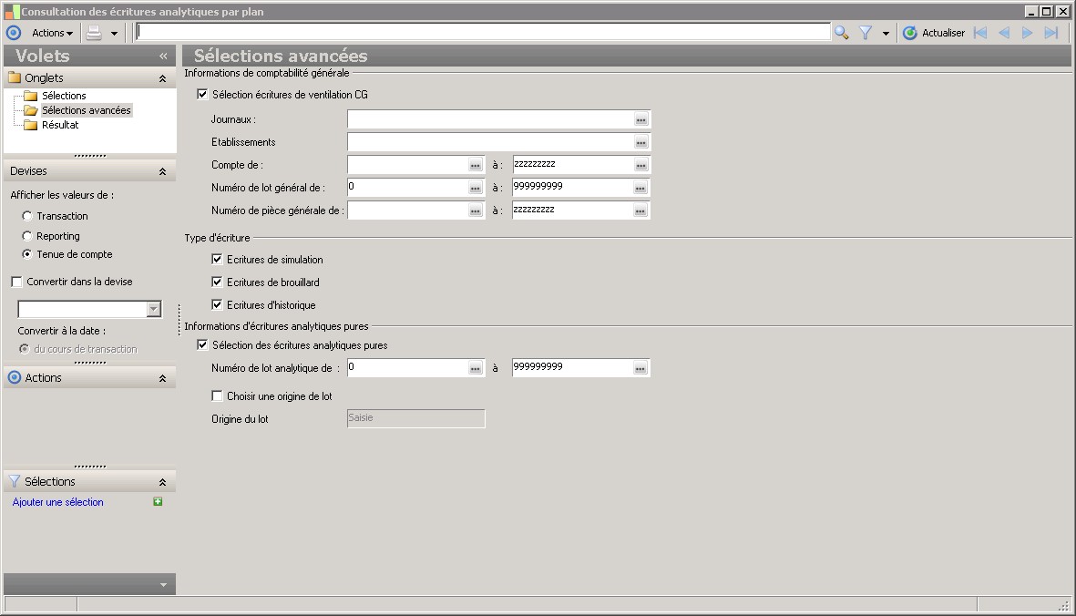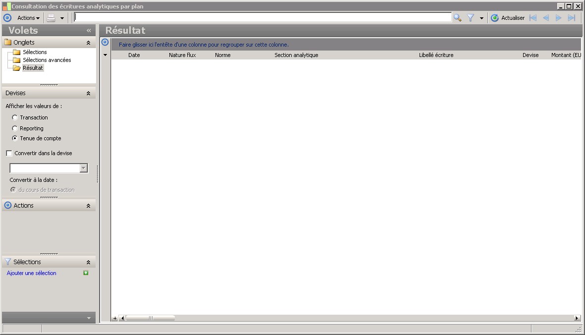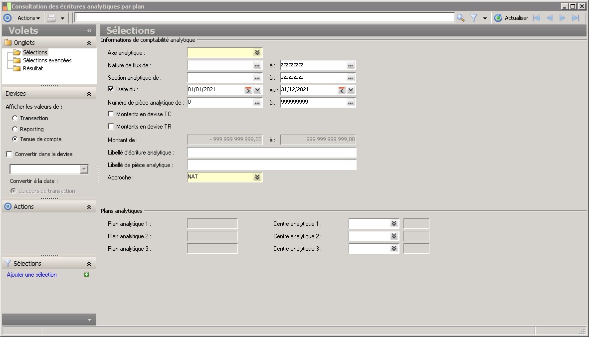 (Sage FRP 1000 Suite Financière) Menu Comptabilité > Analytique > Interrogations / Consultations > Consultation des écritures analytiques par plan