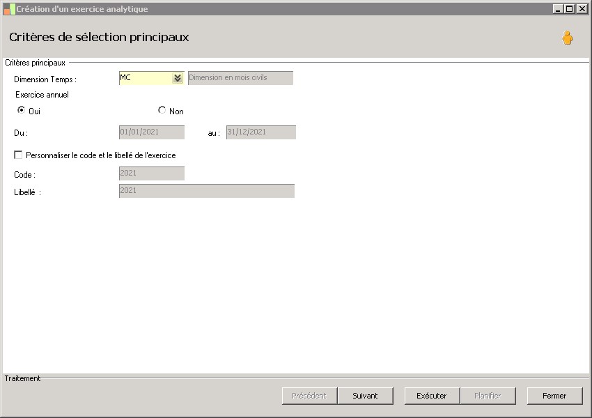 Ce paramètre lorsqu'il est à 'Oui' permet d'initialiser automatiquement les dates de début et fin d'exercice avec le prochain exercice analytique à créer, pour la dimension temps sélectionnée, d'une durée de 1 an. Les dates sont non saisissables.Lorsque ce paramètre est à 'Non', la sélection des périodes de début et fin d'exercice devient accessible. |
