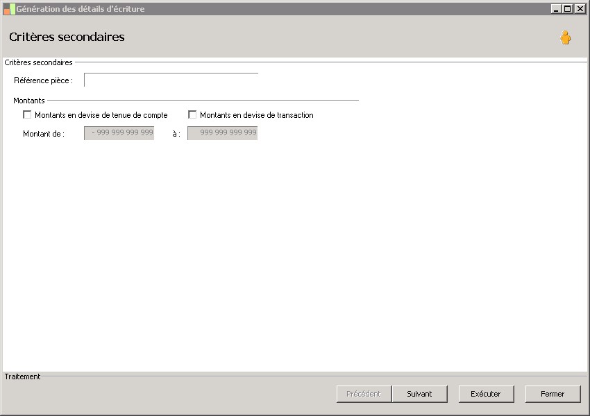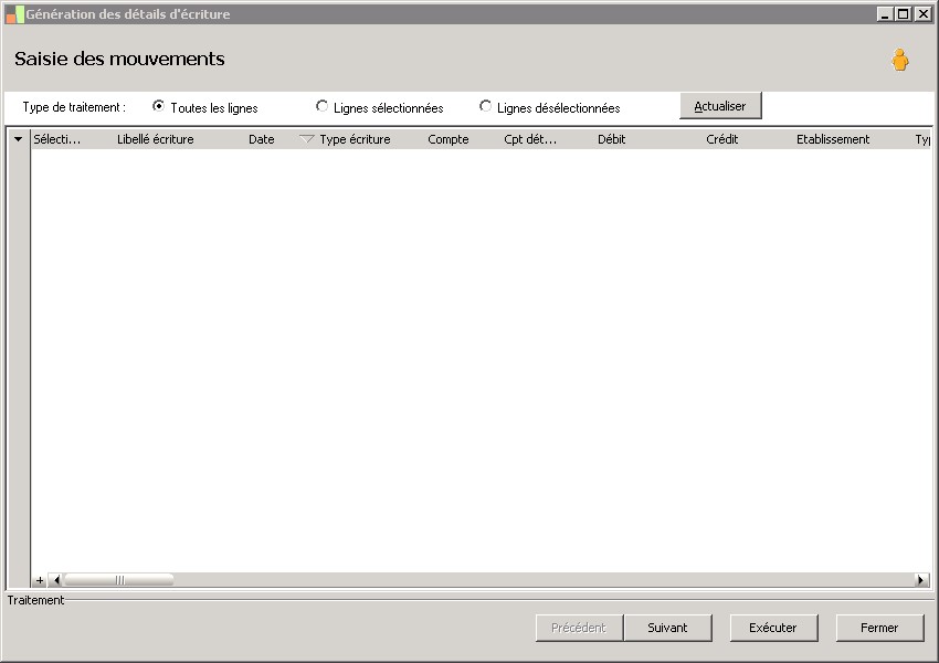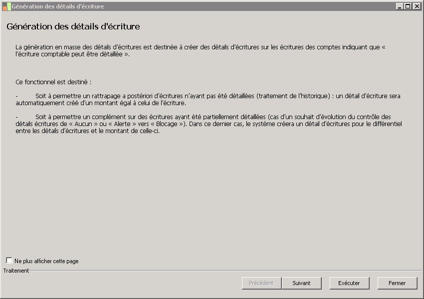 (Sage FRP 1000 Suite Financière) Menu Comptabilité > Initialisation > Détail d'écritures > Génération des détails d'écriture