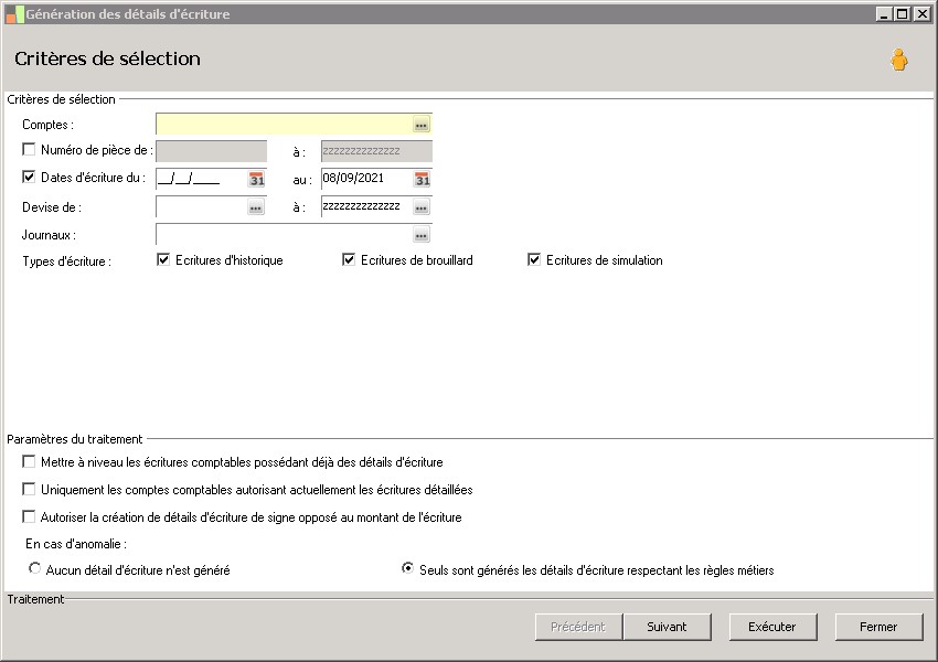 - Si cette case est décochée, ne sont traitées que les écritures répondant aux critères de sélection n'ayant pas de détail d'écriture et portant sur des comptes autorisant la gestion des détails d'écriture.- Si cette case est cochée, sont traitées également les écritures répondant aux critères de sélection ayant des détails d'écriture. |