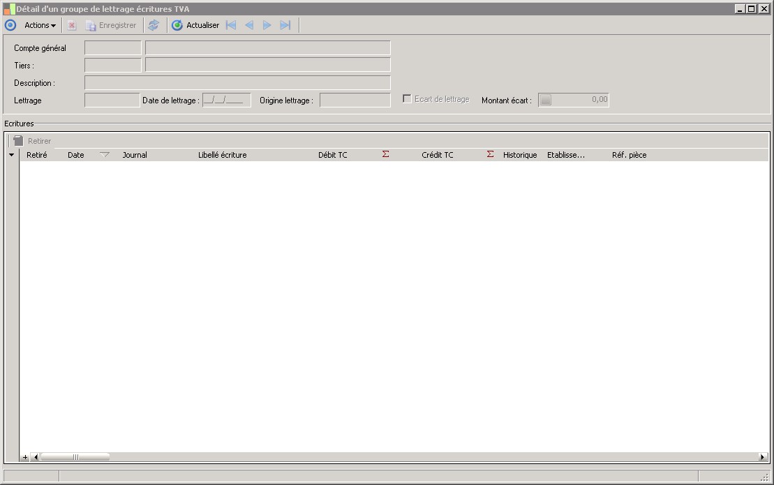 (Sage FRP 1000 Suite Financière) Menu Comptabilité > Générale > T.V.A. > Détail d'un groupe de lettrage écritures TVA
