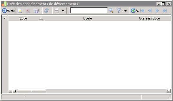 (Sage FRP 1000 Suite Financière) Menu Comptabilité > Paramètres > Comptabilité analytique > Liste des enchaînements de déversements
