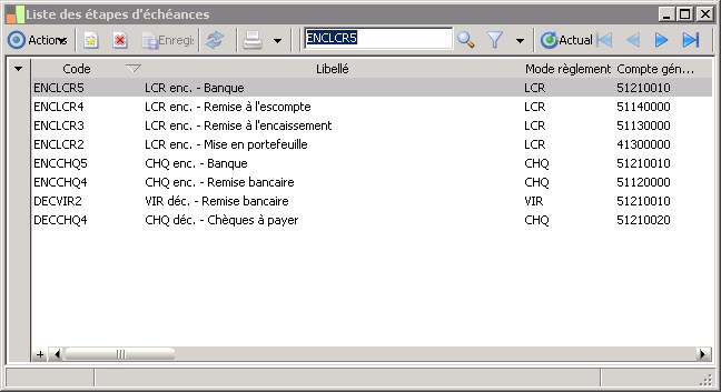 (Sage FRP 1000 Suite Financière) Menu Comptabilité > Paramètres > Echéancier > Liste des étapes d'échéances