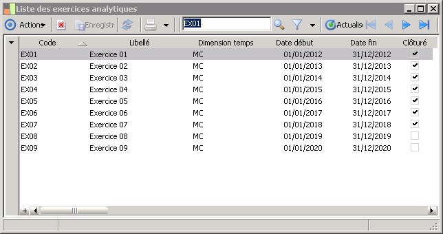 (Sage FRP 1000 Suite Financière) Menu Comptabilité > Paramètres > Comptabilité analytique > Liste des exercices analytiques