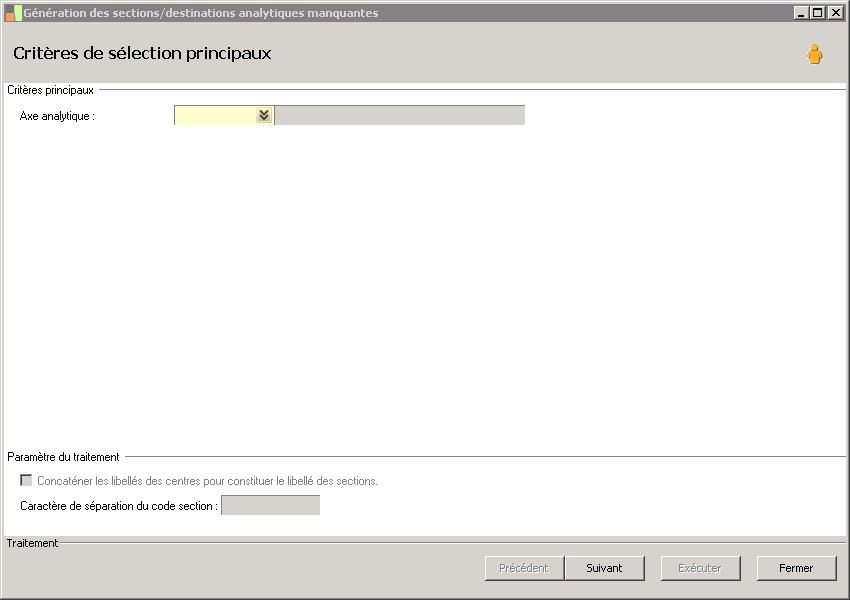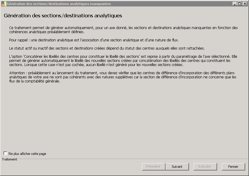 (Sage FRP 1000 Suite Financière) Menu Comptabilité > Fichiers de base > Sections / Destinations > Génération des sections/destinations analytiques manquantes