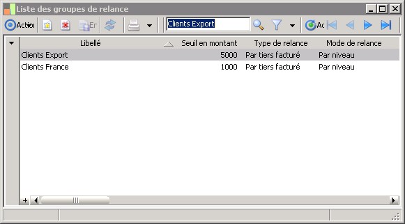 Le groupe de relance permet de définir des critères de relance communs à plusieurs échéances.