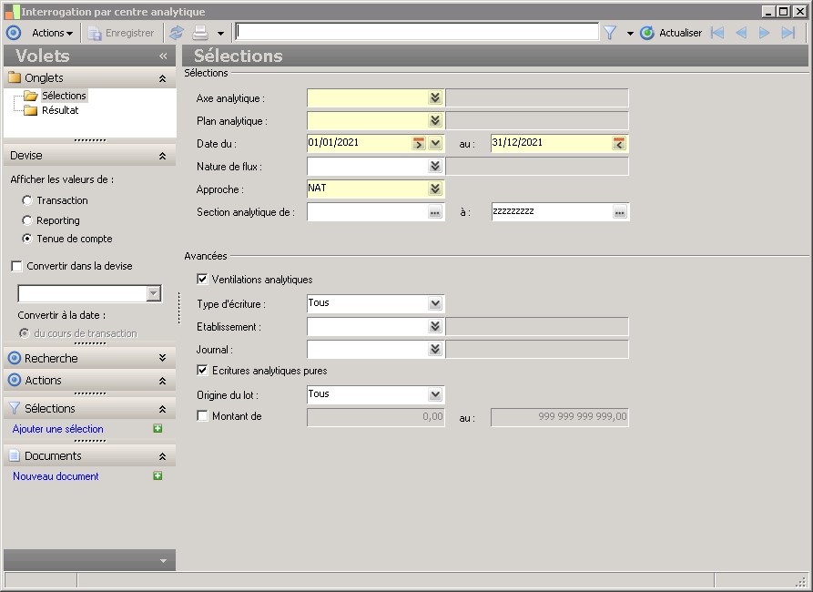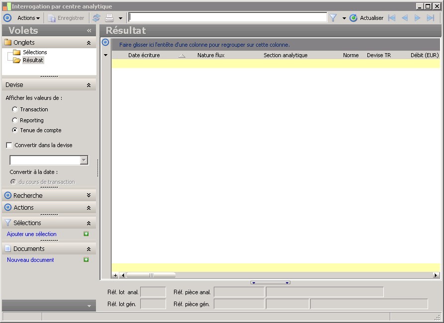 (Sage FRP 1000 Suite Financière) Menu Comptabilité > Analytique > Interrogations / Consultations > Interrogation par centre analytique
