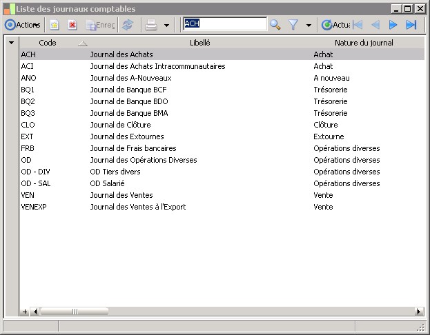 (Sage FRP 1000 Suite Financière) Menu Comptabilité > Paramètres > Comptabilité générale > Liste des journaux comptables