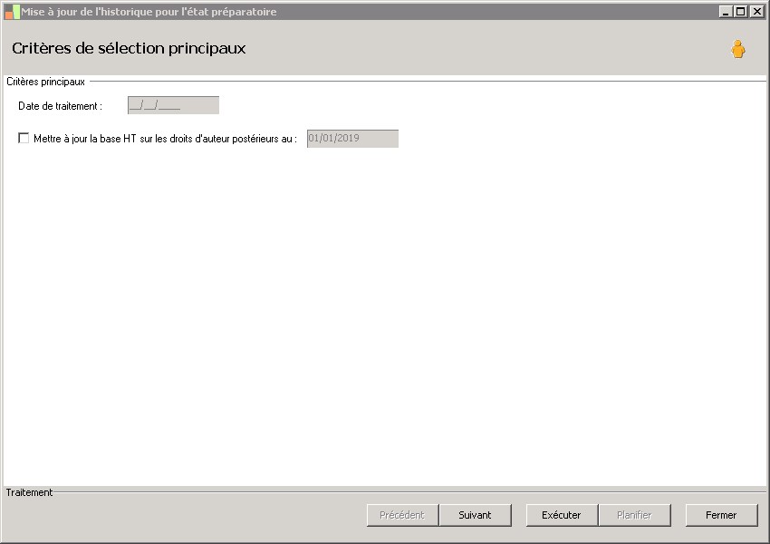Il s'agit de la date utilisée pour la mise à jour de la base HT sur les droits d'auteur. Cette date reprend par défaut la date de traitement si elle est renseignée mais il est possible de la modifier. Si aucun état préparatoire confirmé n'a été trouvé, la date proposée correspond à J-1 par rapport à la date de début du premier exercice comptable ouvert. |