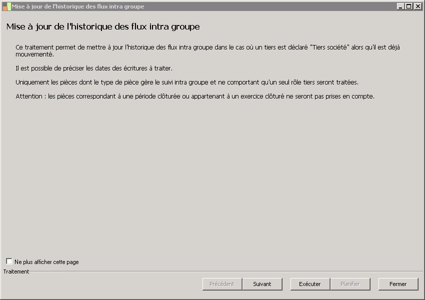 Outils / Mise à jour / Mise à jour de l'historique des flux intragroupe permet de mettre à jour l'historique des flux intra groupedans le cas où l'environnement groupe est mis en place, alors qu'un tiers déclaré « Tiers société » possède déjà des écritures.